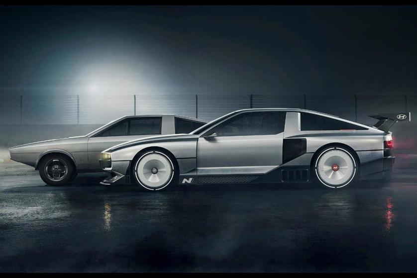 The original Hyundai Pony Coupe (rear) served as inspiration for the DMC DeLorean, Hyundai Ioniq 5 and N Vision 74 (front).