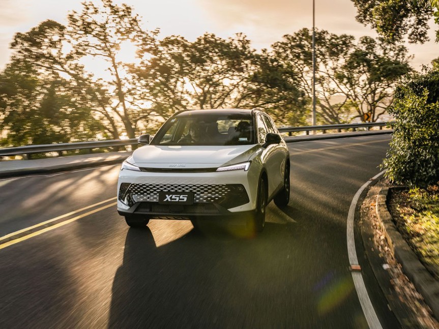Standard equipment for the X55 includes ventilated seats, dual-zone climate control, a 360-degree camera, and a power tailgate, while the interior features a 10.1-inch central control screen alongside a 10.25-inch LCD instrument panel and wireless phone connectivity. A chilled centre console cubby is also standard, as is panoramic sunroof and 19-inch alloy wheels.