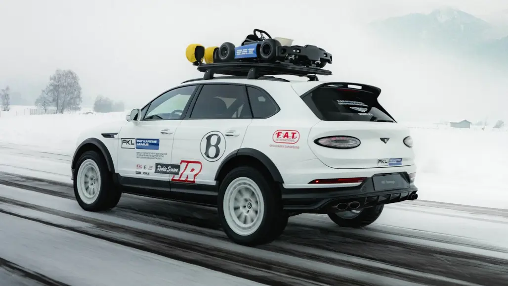 In true concept-car fashion, Bentley has also demonstrated the roof system’s carrying ability with an electric Bambino-size go-kart, the same type used in the FAT Karting League mounted on top. These additions push overall height to 2.49 metres.