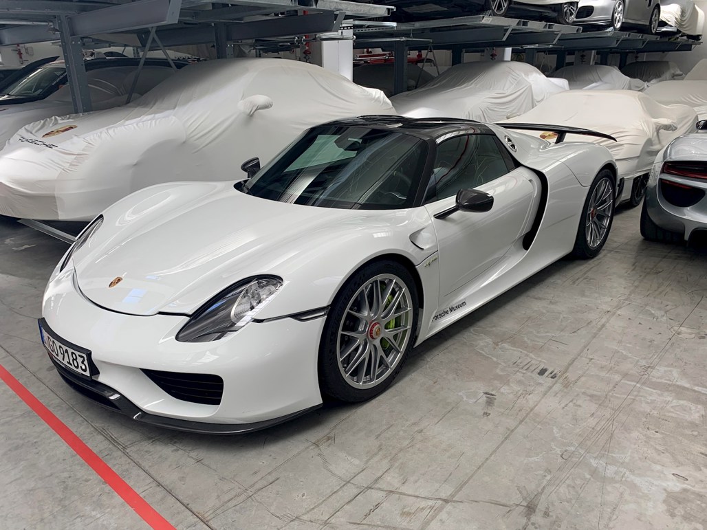 Two Carrera GT and two Porsche 918 Spyder press vehicles sit on the floor alongside Porsche’s modern Le Mans cars, with names like Brendon Hartley and Mark Webber identifying the drivers. There are rear-engined 928s, prototypes for electric Boxster and Cayman models, plus the original Taycan prototype, the Mission E.
