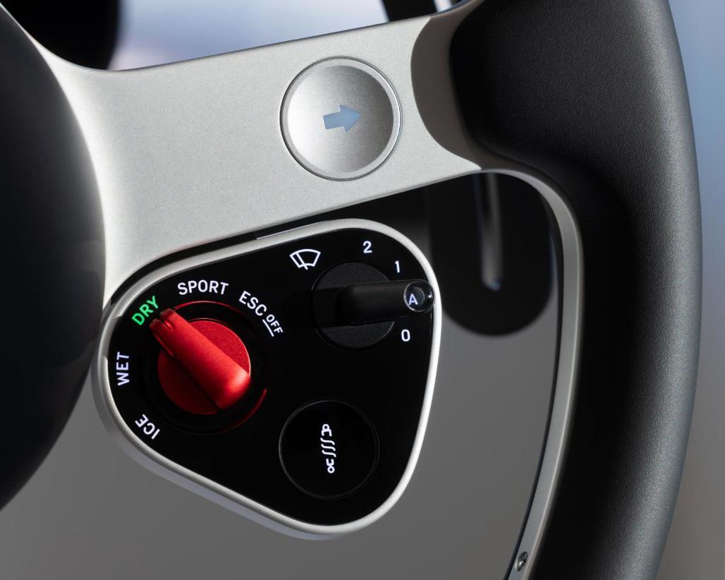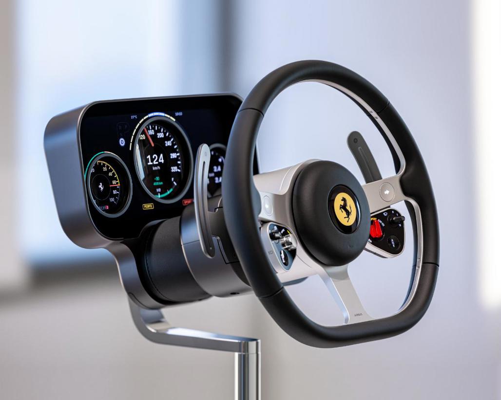 The design team intentionally chose a simplified three-spoke form for the wheel, reinterpreting the iconic 1950s and 60s wooden three-spoke Nardi wheel. The aluminium structure of the spokes is intentionally exposed and highlighted, and the wheel weighs 400 grams less than a standard Ferrari steering wheel.