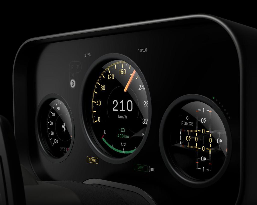 Ferrari says the instrument cluster is inspired by both "historic automotive cues and the purposeful, clear graphics found in aviation" and are designed to resemble analogue gauges while being fully digital beneath their surface.