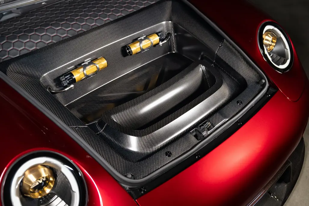 The carbon fibre bodywork draws heavily from the Gunther Werks Turbo, ditching the traditional ducktail in favour of a large fixed rear wing.