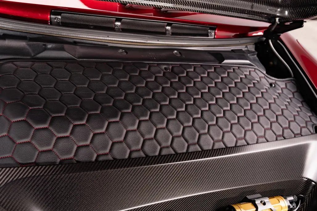 Carbon-backed seats, matching red and black leather, and further gold detailing round out a cabin that feels more like a showpiece than a place to quietly go about your driving.