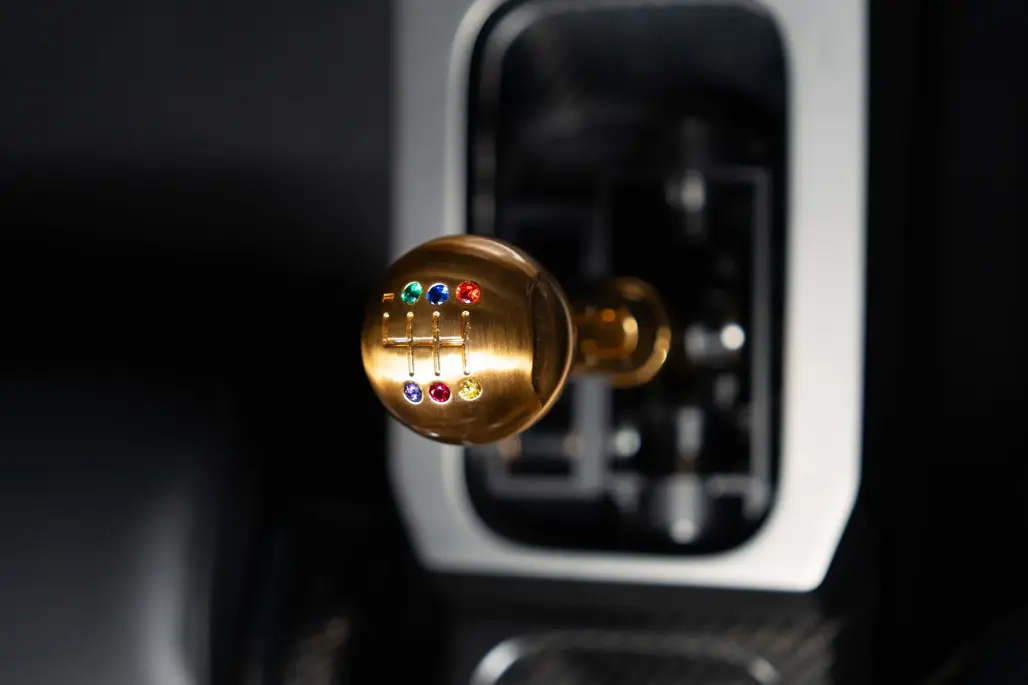 Inside, the concept continues. A bespoke gear shifter features 24-karat gold and a set of coloured stones representing each of the six gears in an an unmistakable nod to the Infinity Stones.