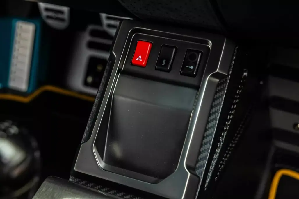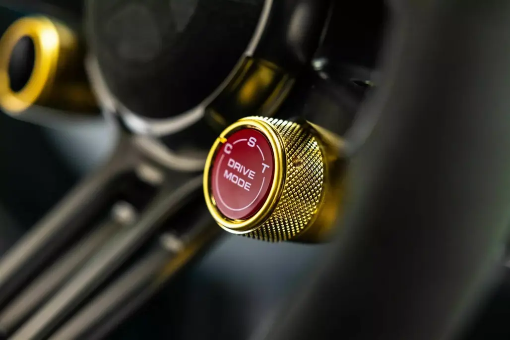 Carbon fibre bucket seats and a carbon-clad dashboard set the tone, while an Alcantara-wrapped steering wheel, complete with gold gauges and a gold 12 o'clock marker, adds a touch of bespoke elegance.