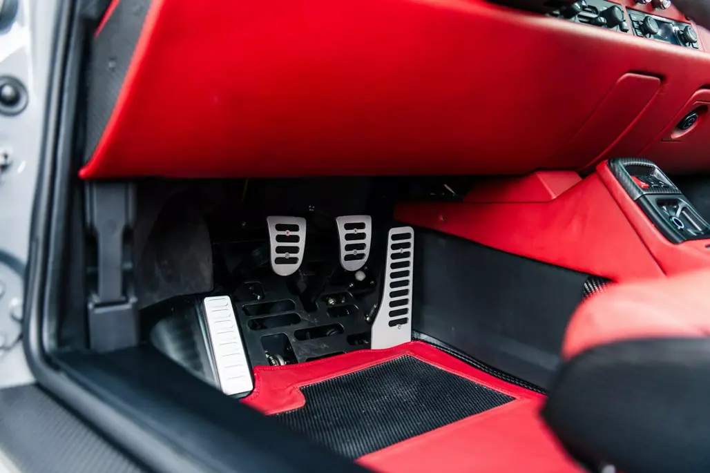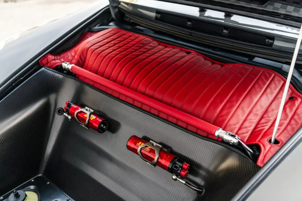 The cabin features extensive use of carbon fibre, complementing the luxurious red leather that adorns the bucket seats, dashboard, and door panels.