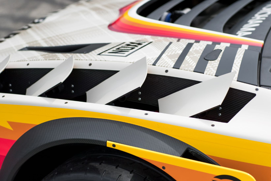 The bodywork is constructed entirely of carbon fibre, draped over a VSC-engineered chassis and a roll cage certified to WRC standards.