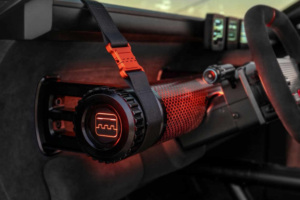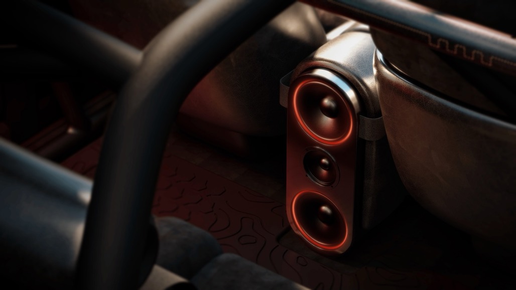 Think crash-pad ambient glow filtering through perforated metal, wraparound seats with four-point harnesses and a visible roll cage that doubles as both structure and statement.