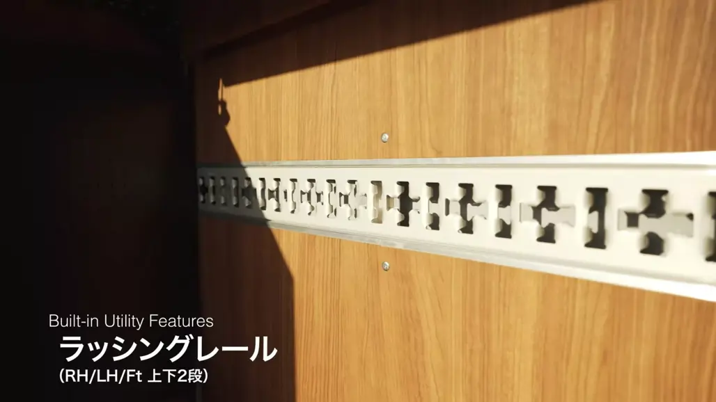 There’s timber underfoot, modular shelving along the walls, lashing rails for flexibility and a proper sofa facing a fold-out table.