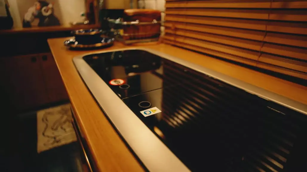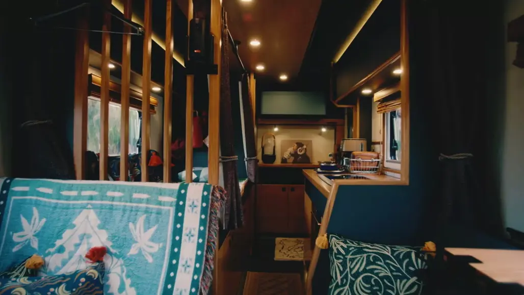 Inside, the atmosphere shifts to warm wood finishes and apartment-style comfort. There’s a dining area, full kitchen, convertible sofa bed and a separate rear bedroom, complete with a projector.