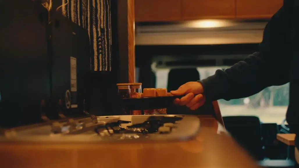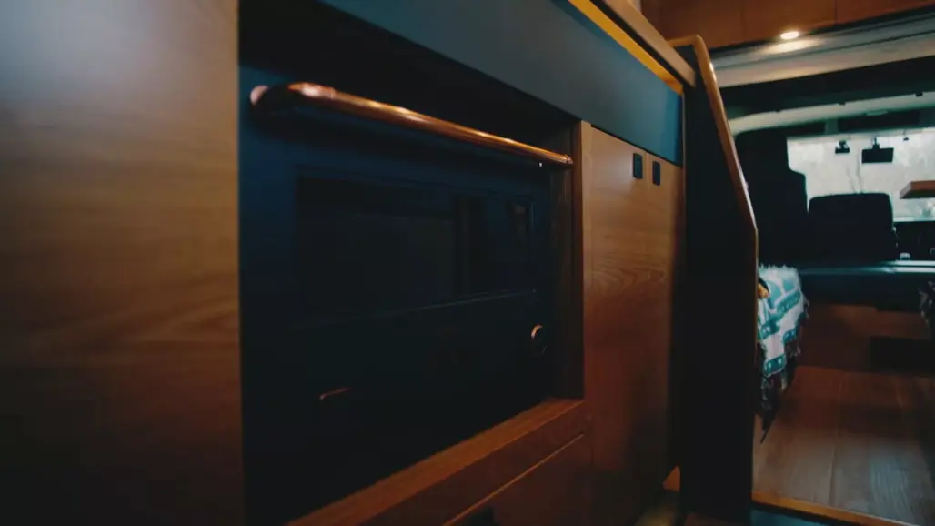 A large gullwing door and drop-down side panel lift to reveal a compact living space that feels more boutique studio than box truck.