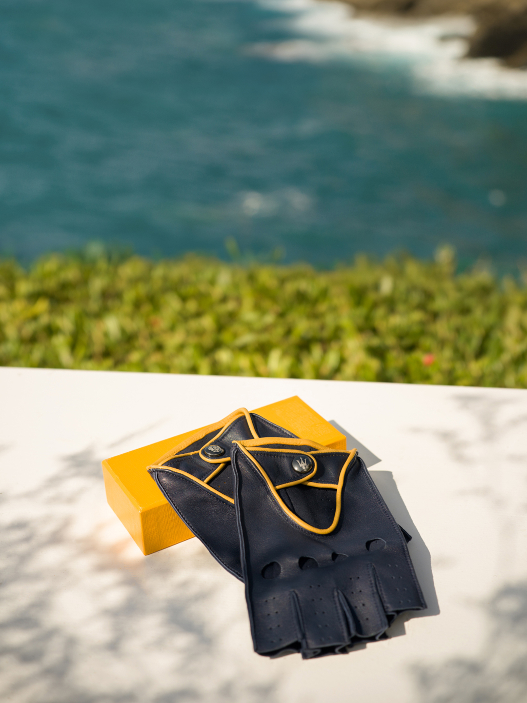 The gloves, "designed for comfort and grip, are fingerless, perforated at the knuckles, and fastened with tone-on-tone laser-etched buttons". And actually, they'd probably be quite appropriate for your classic Ghibli Spyder.