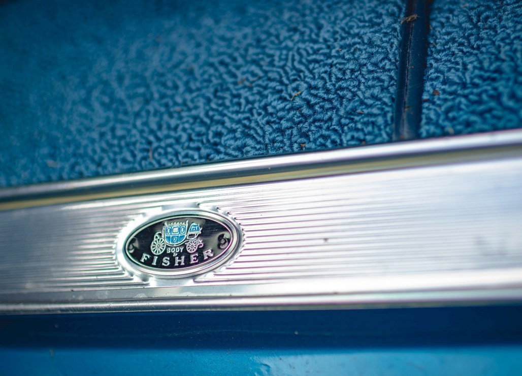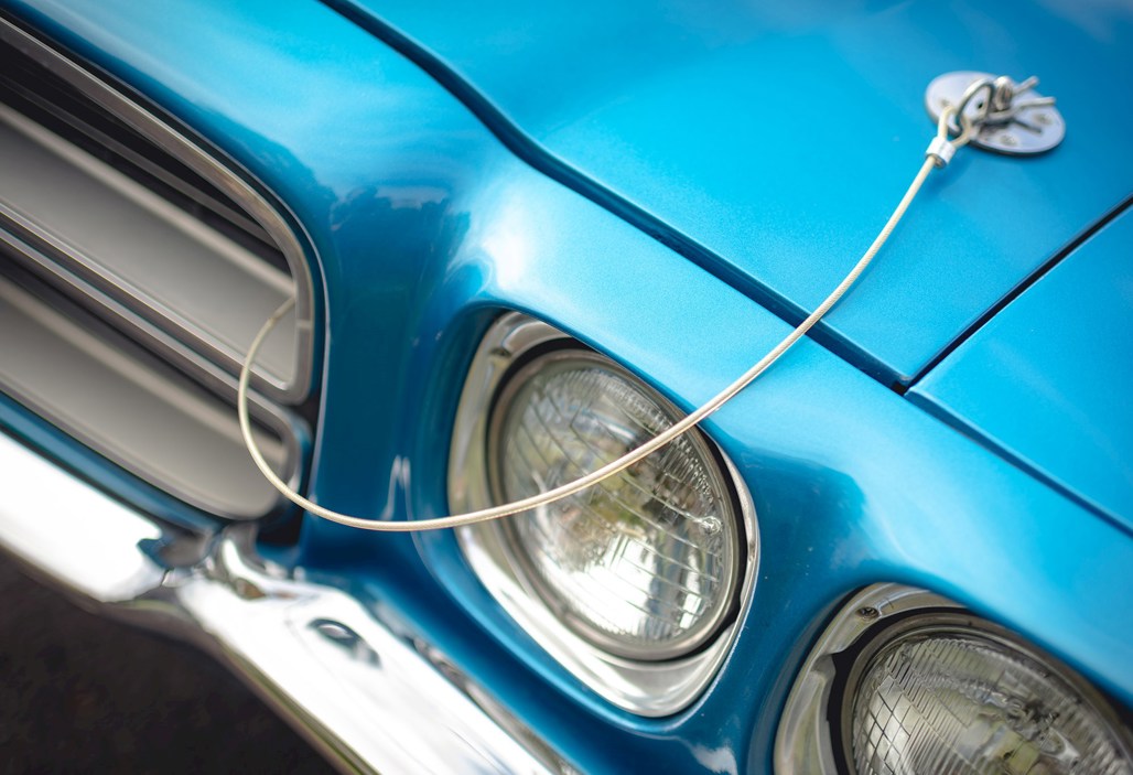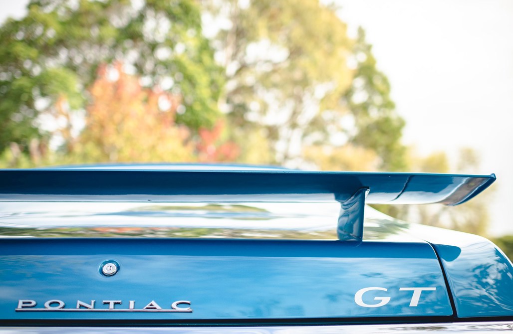 A 1972 Pontiac LeMans GT 400; engine, 400 ci; transmission, TH400 automatic. Its colour is Lucerne Blue, the interior is deluxe cloth and vinyl. The options are a hood tach, factory eight-track stereo, air conditioning, tinted glass and a rear “surfboard” spoiler. It still has its original spare tyre from 1972.