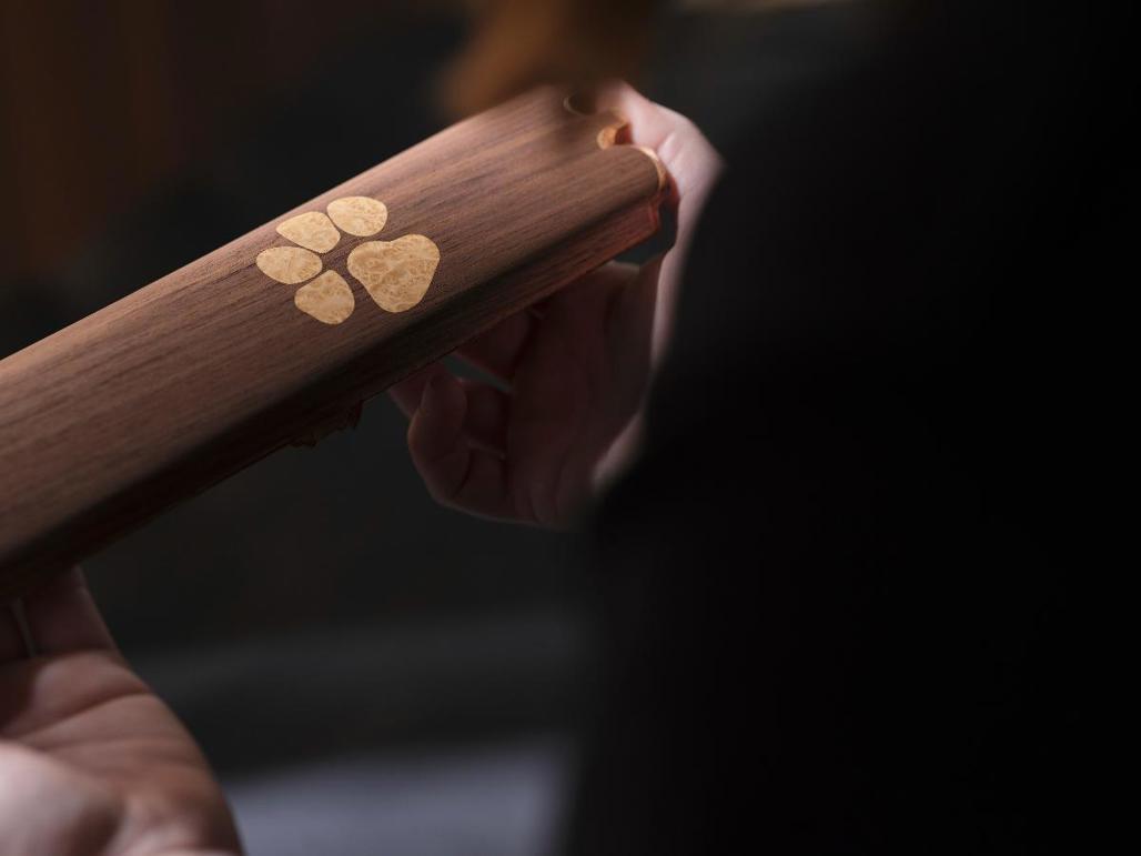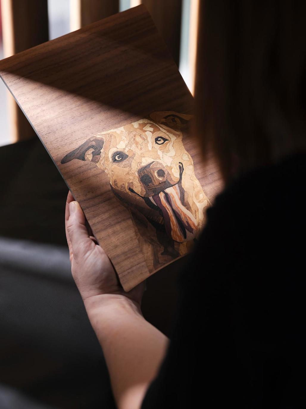 No staining of artificial treatments were used to match Bailey's colours, instead each piece was for its natural hue and pattern, with grain direction, tone, and texture of the wood being used to represent Bailey's fur.
