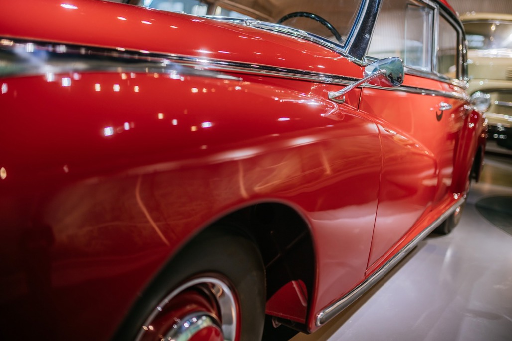 Most examples were finished in muted tones, making the museum’s red display car a rare and eye-catching variation.