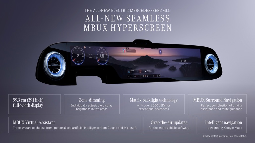 - Interior highlights include a 39.1-inch MBUX Hyperscreen, up to 1740L boot space, and a 128L frunk.