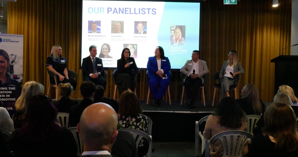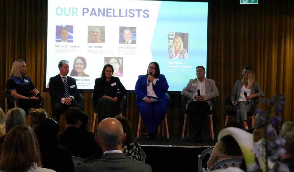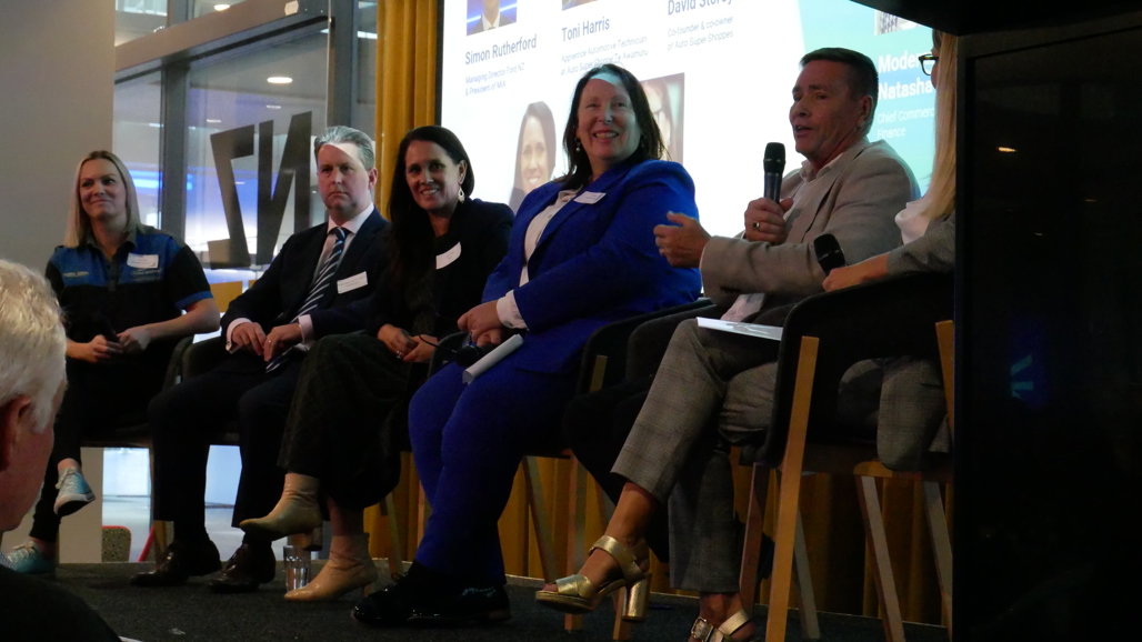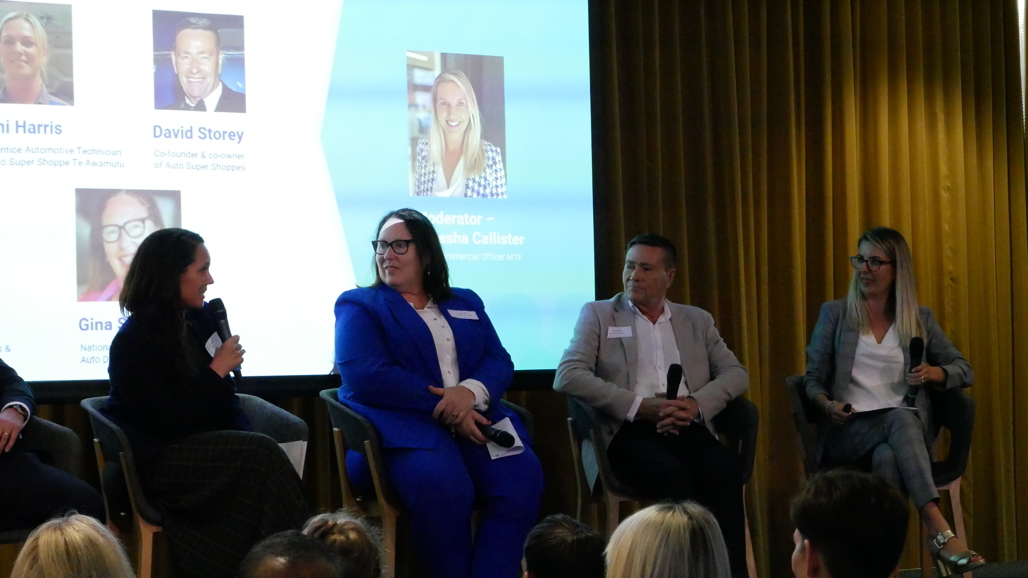 The panel (above, from left to right) comprised Toni Harris (apprentice automotive technician, Auto Super Shoppe Te Awamutu), Simon Rutherford (managing director Ford NZ, president of MIA), Louise Sixton (general manager of sales & operations, Repco NZ), Gina Sim (Auto Drive Holdings), David Storey (Auto Super Shoppes) and Natasha Callister (moderator, chief commercial officer, MTF).