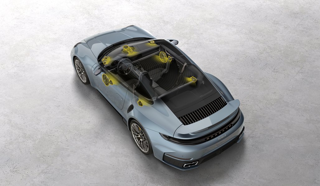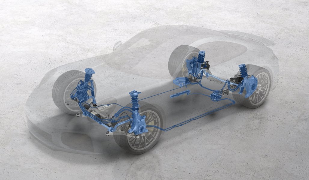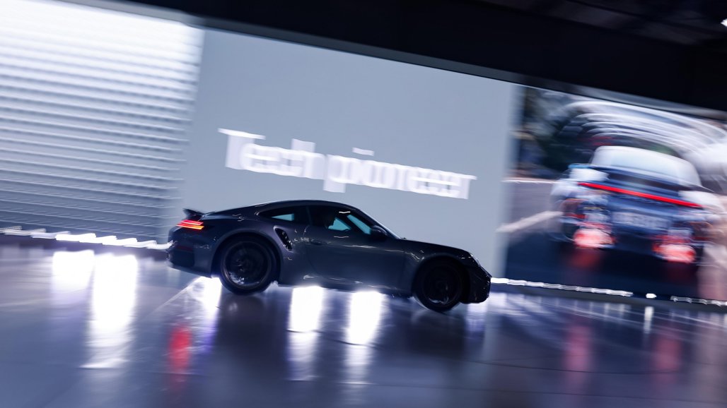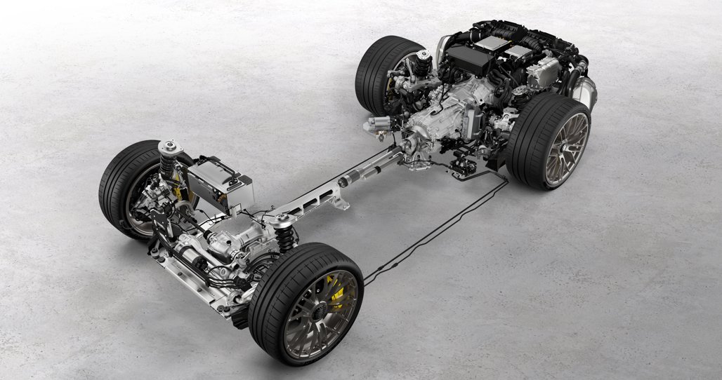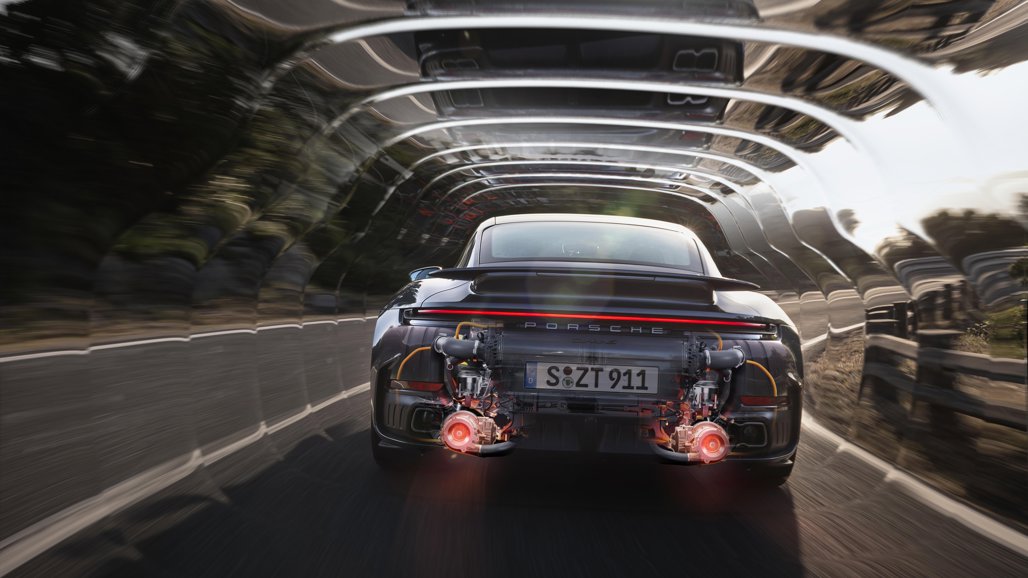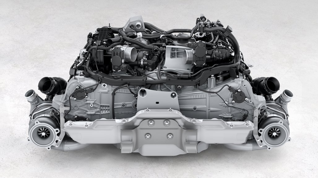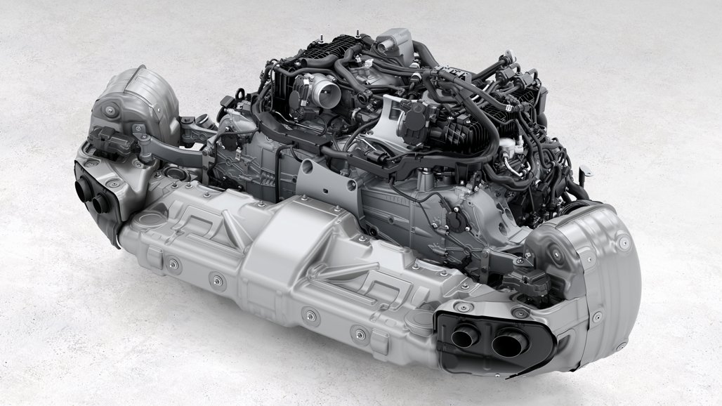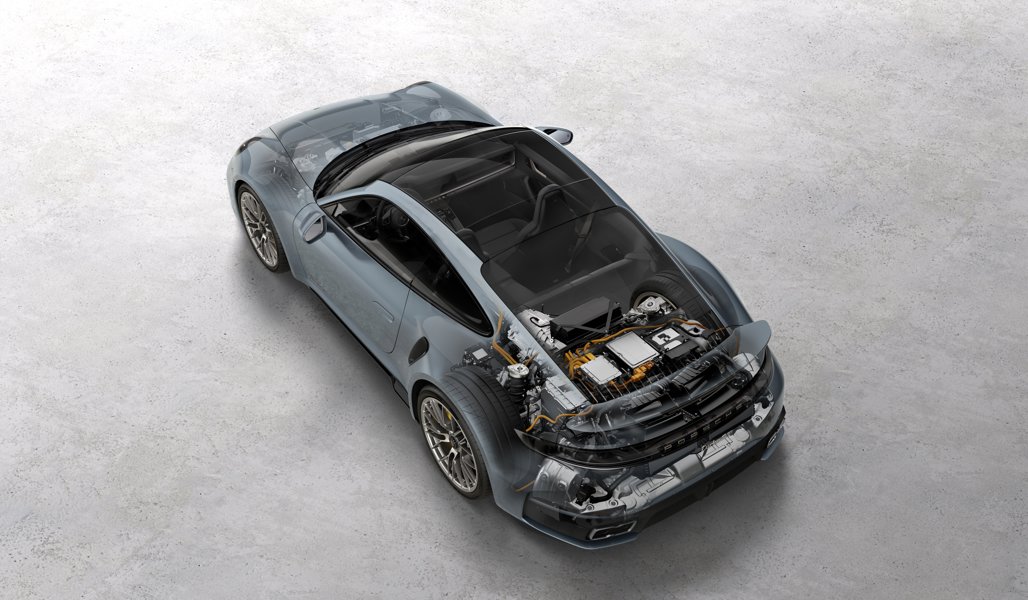 The 3.6-litre boxer engine works with a pair of electrically assisted turbos and an integrated motor within the eight-speed PDK.