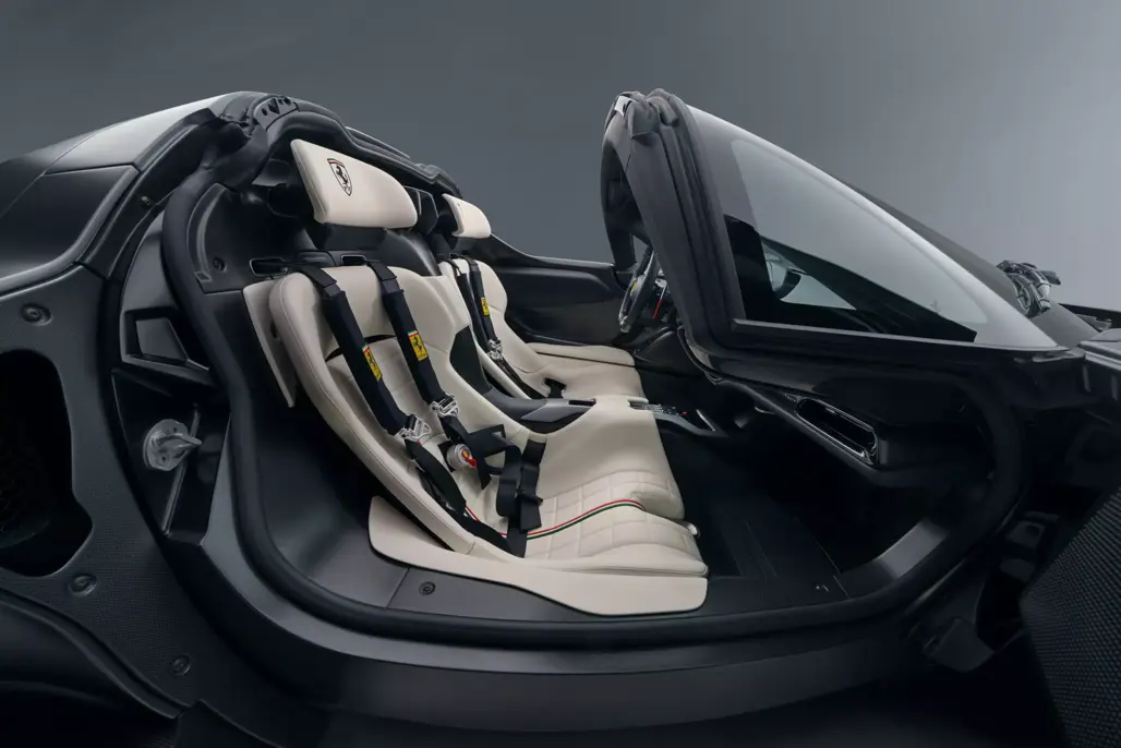 Inside, buyers can commission a bespoke retrim in almost any leather or Alcantara finish, tailoring the two-seat cabin beyond Ferrari’s original palette.
