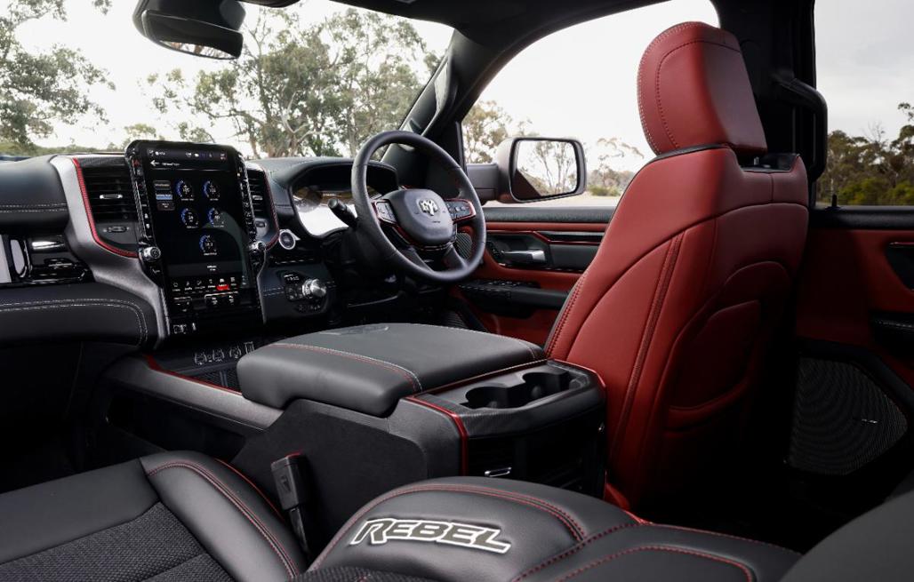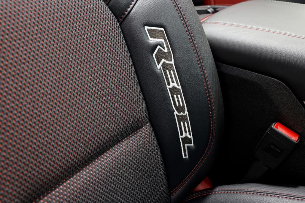 Inside, the Ram 1500 Rebel features a unique red-and-black trim combination with Rebel stitching on the front seats, which are also heated, as are the outside rear seats. A panoramic sunroof is standard, along with a 19-speaker Harmon Kardon sound system, a widescreen 12-inch digital instrument cluster and14.4-inch infotainment screen.