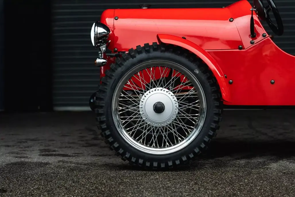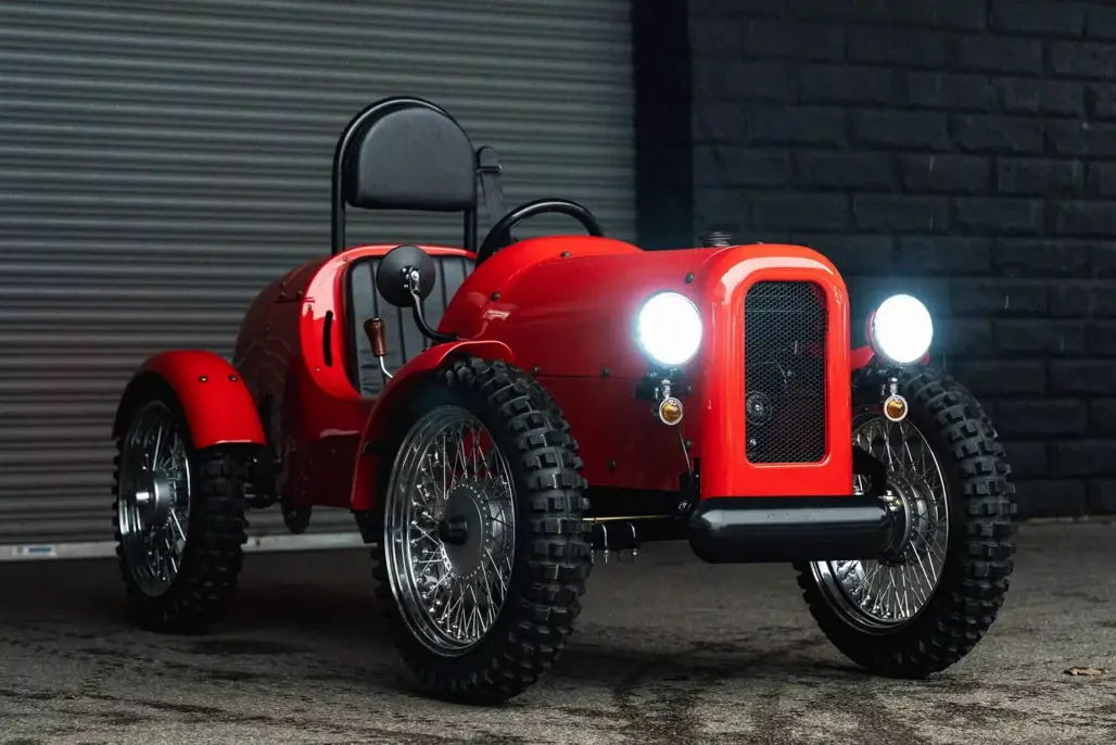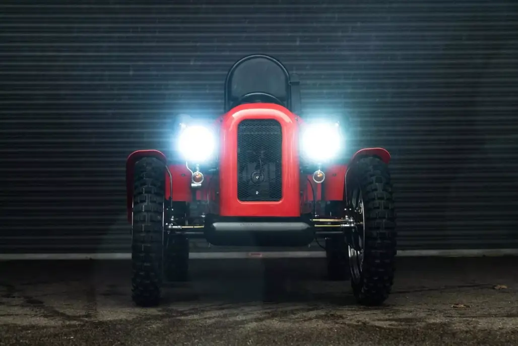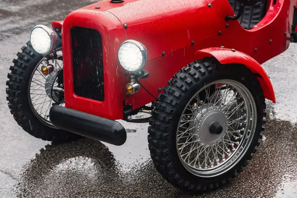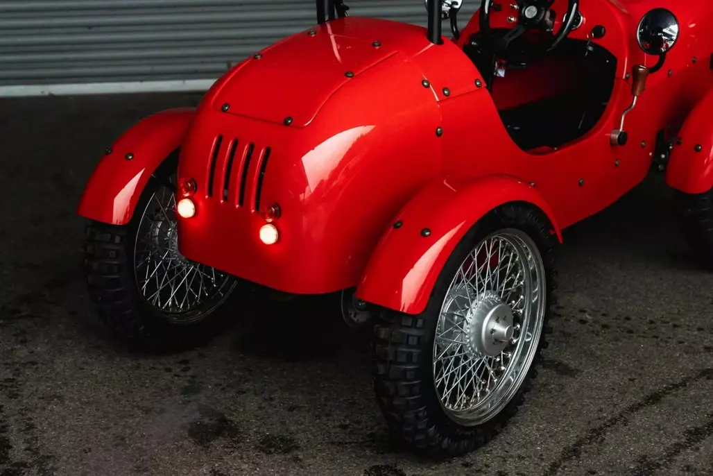At just 2286mm long, the Rivet is about the size of a large bicycle with ambition. Its styling sits somewhere between a pre-war roadster and a miniature farm runabout. Wire wheels wear 17-inch tyres, and generous ground clearance gives it a purposeful stance.