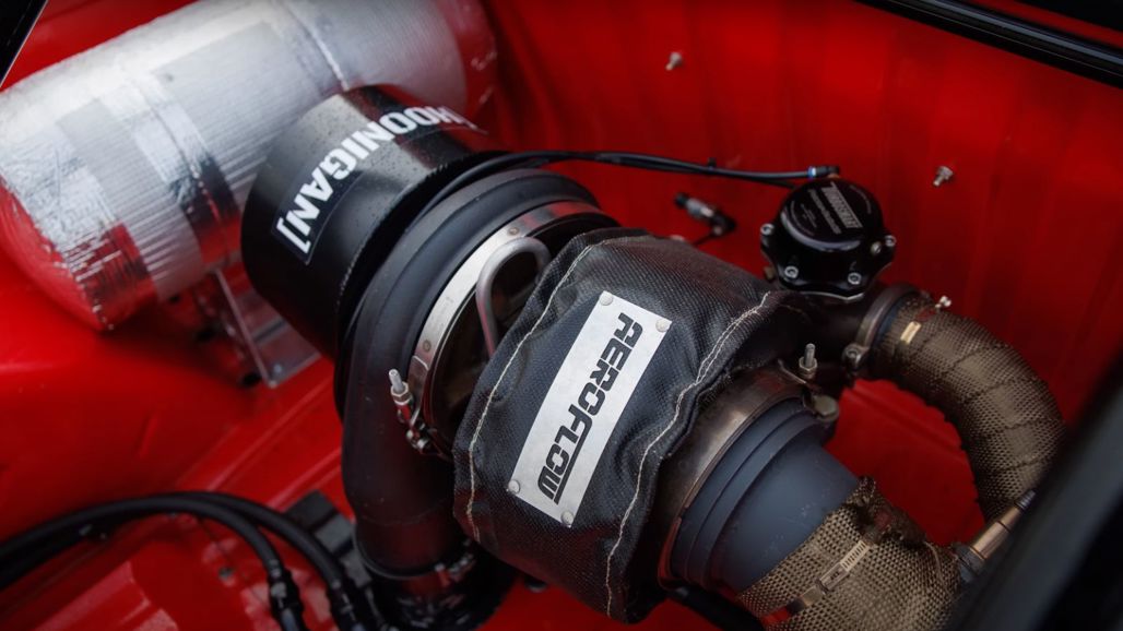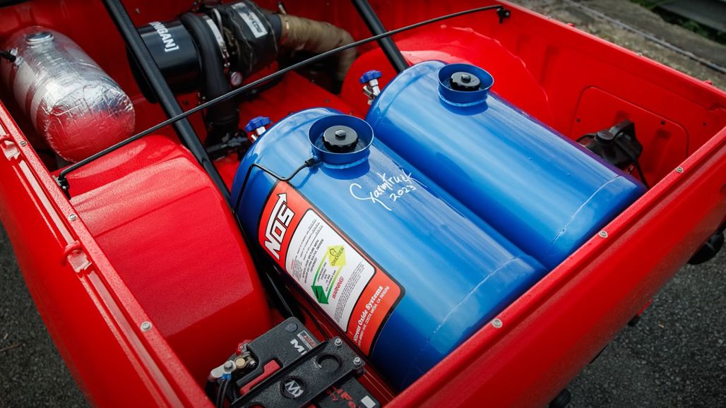 While the front remains relatively untouched, the truck’s rear has seen substantial modifications. A larger 9-inch differential along with 35-spline axles have been introduced to harness the newfound power efficiently. The original twin-turbo setup made way for a single-turbo, now nestling at the rear, while the engine retains its stock internals, augmented with a Haltech ECU, a custom exhaust, and an E85 tune. The ute's bed houses two fuel tanks made to look like NOS bottles, providing around 120L of petrol.