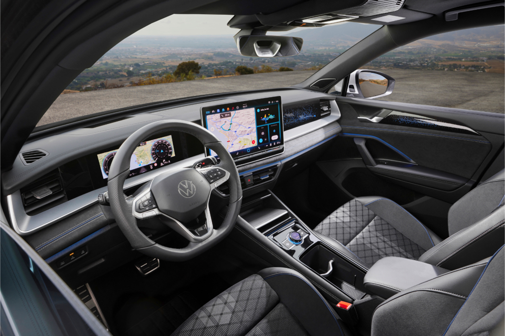 The R-Line also adds 20-inch alloy wheels, a more comprehensive camera-view system, IQ. Light matrix headlamps, dynamic indicators, illuminated rear “VW” logo, sports steering wheel and ergoActive part-leather front seats with heating, ventilation and massage functions, plus a larger 15-inch infotainment and head-up display.