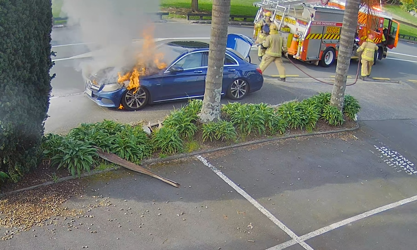 This is the moment a hybrid-electric car burst into flames on an Auckland street.