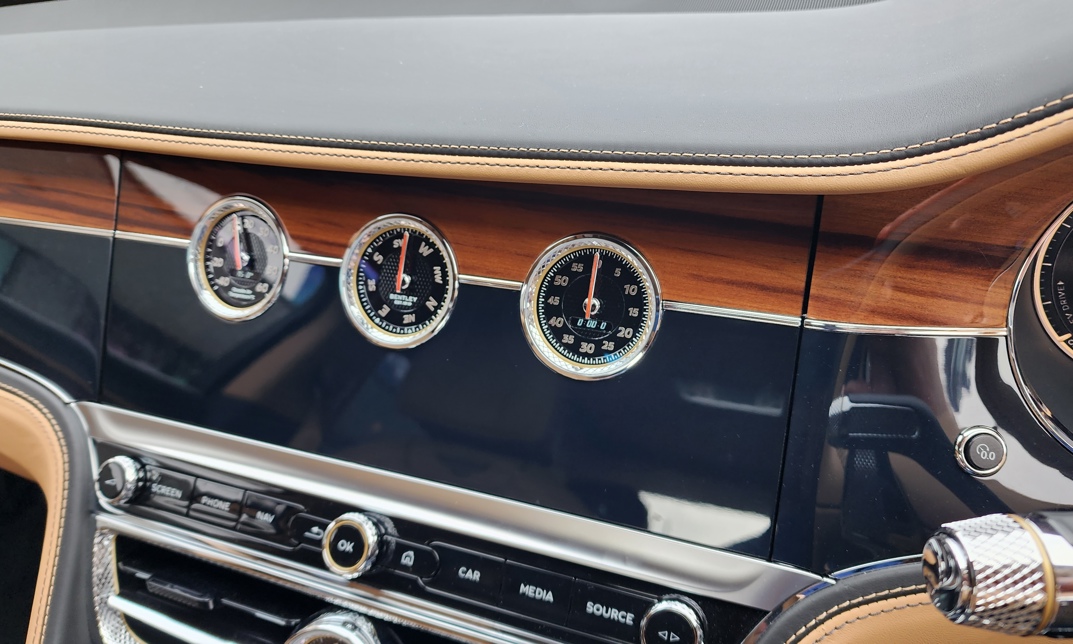 The ideal metaphor for the Bentley’s balance of old and new is surely the rotating centre screen. On one side it’s a digital infotainment display, with tiles including a range reading for the electric stuff. But press a button and it rotates to become a dual-veneer Liquid Amber/Grand Black panel (matching the rest of the dashboard trim) with three analogue dials. Largely frivolous dials – outside temperature, compass and a stopwatch – but undeniably beautiful ornaments.
