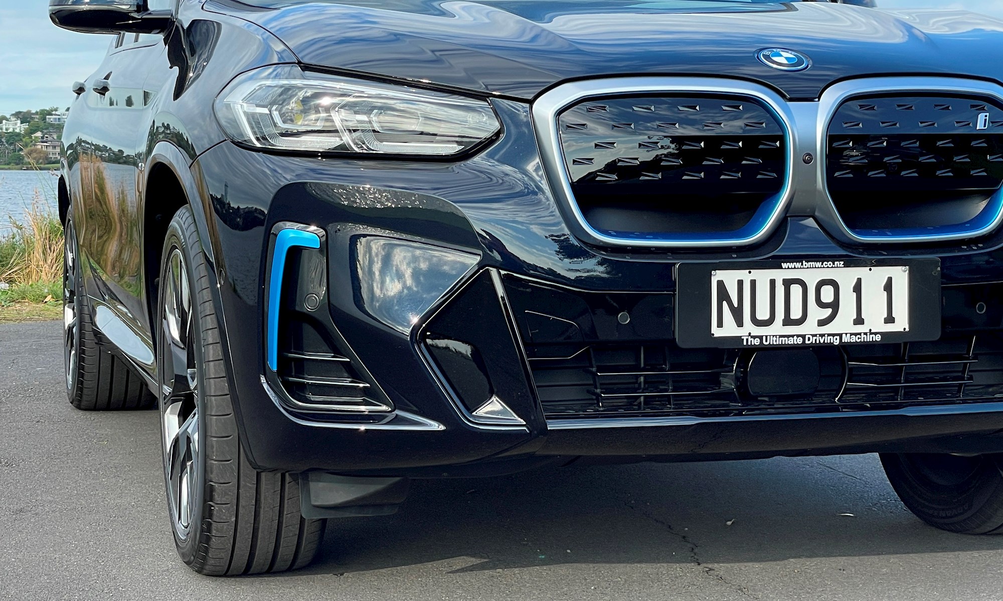Being a BMW-i product, the iX3 is not completely low-key of course. There’s the blanked-off grille with prominent i-badge, special M “Bicolour” 20-inch wheels and on our test vehicle, lots of detailing that signature i bright blue.