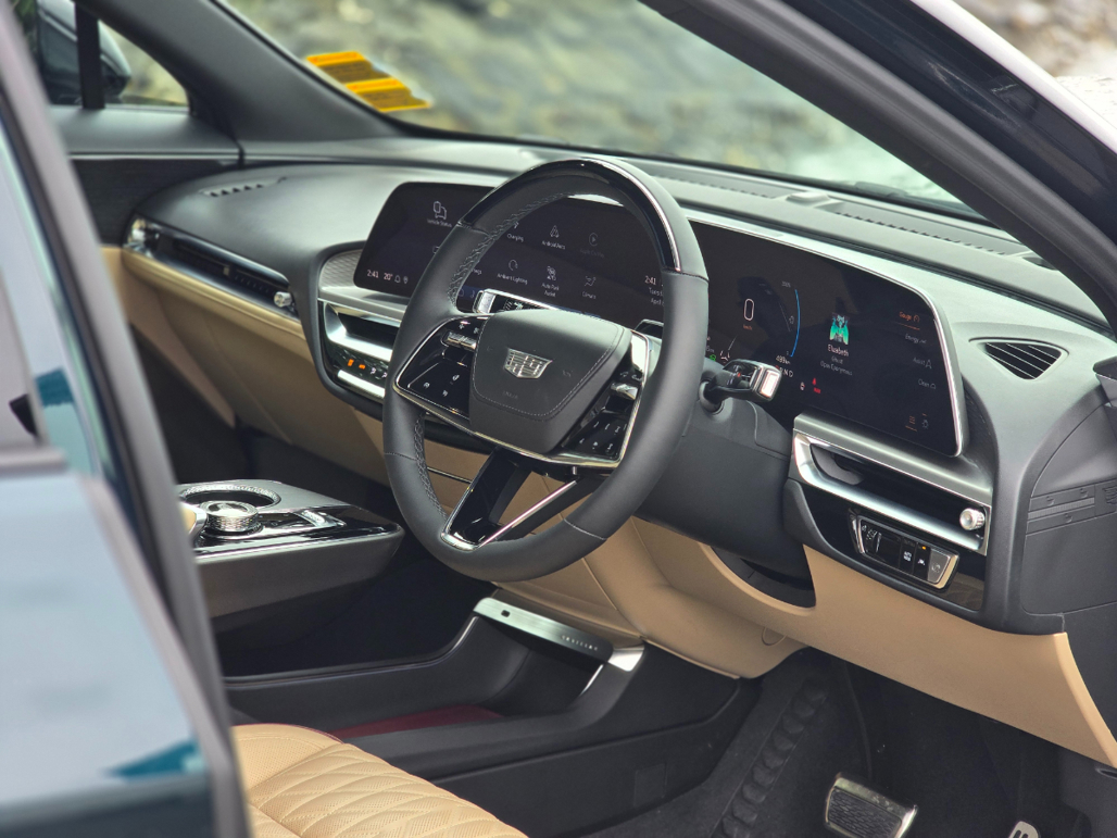 Possibly the Lyriq’s most nifty feature is a dynamic one. There’s a paddle on the left-side of the steering column that’s not for gears (the Caddy EV only has one, after all), but rather regen.
