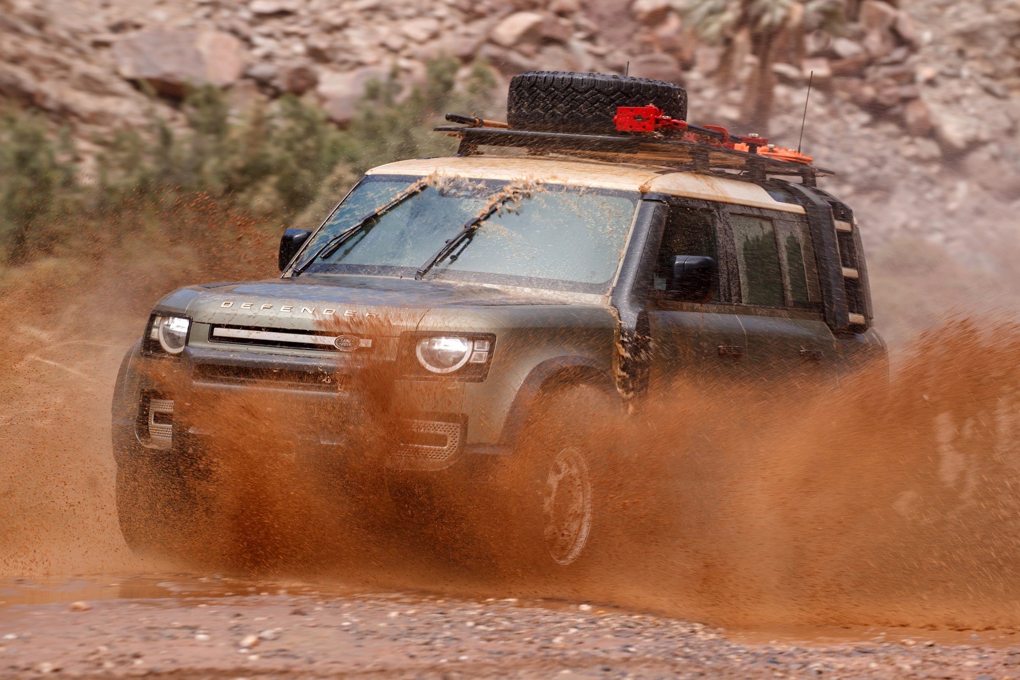 There’s no argument we’re seeing Defender at its off-road best. Our 177kW/430Nm D240 and 294kW/550Nm P400 expedition models are fitted with the Explorer Pack (roof rack, side-mounted gear carrier, raised air intake and wheel arch protection) and a few bespoke items designed just for this trip, like rapid-acess mounting systems for the spare wheel on the roof and a side ladder.
