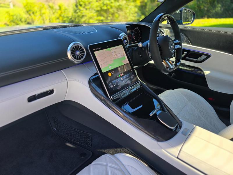 The suspension is lowered by 10mm, and the AMG active ride control adjustable suspension setup is standard, as is the panoramic sunroof. You also get four-wheel steering, allowing the rear axle to turn when cornering, and of course, it’s all-wheel drive.