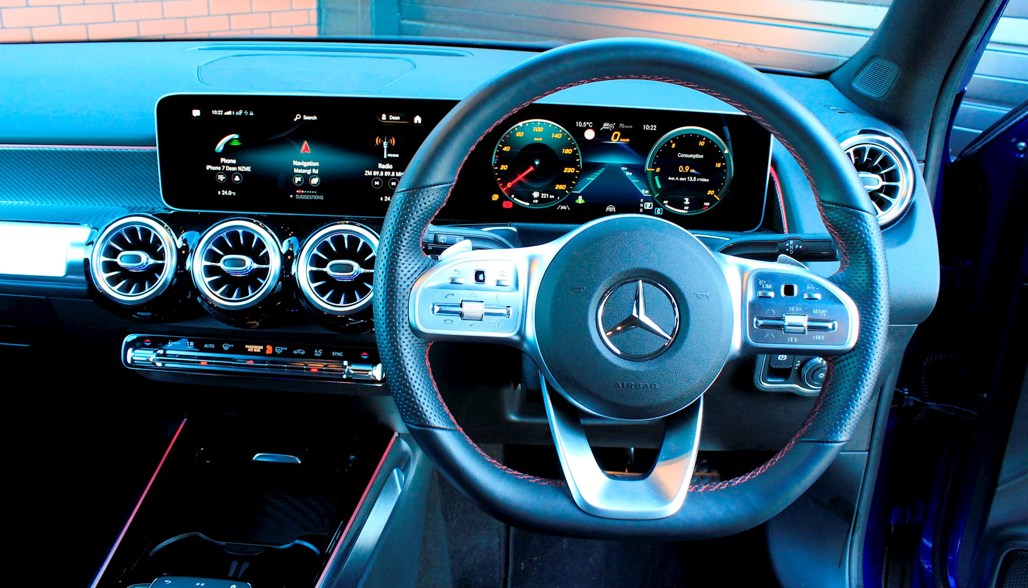 Of course there’s radar cruise control (great), lane-change assist (very good, but often beeps on straight roads with no input), and seat kinetics and interior trim colour changing (all good features). And of course the MBUX widescreen dash/multi info display, which offers a depth of information literally at your thumb and fingertips, via either the touchpad on the centre console or steering wheel. Or, of course, the ‘Hi Mercedes’ voice control, for things like easy climate control changes, which learns the more it’s used.