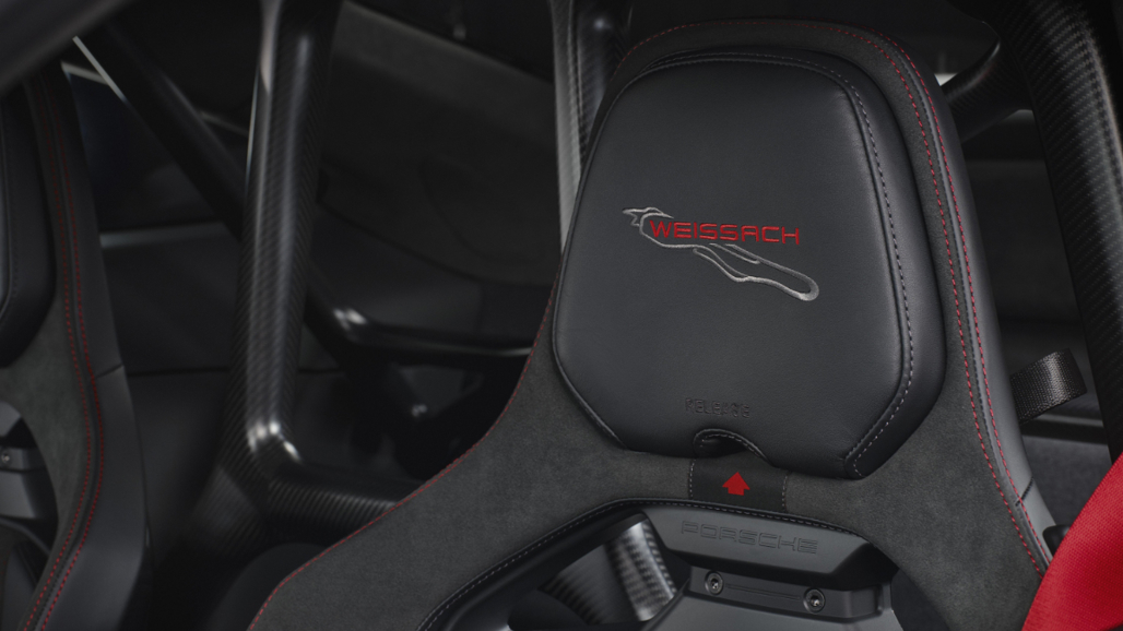 The interior features a rear roll cage (carbon fibre), lightweight door panels and many Weissach Package logos. Our particular car is also fitted with lightweight bucket seats (another $12,310) that feature removable head-restraint padding, providing a more hollowed-out place for your helmet.