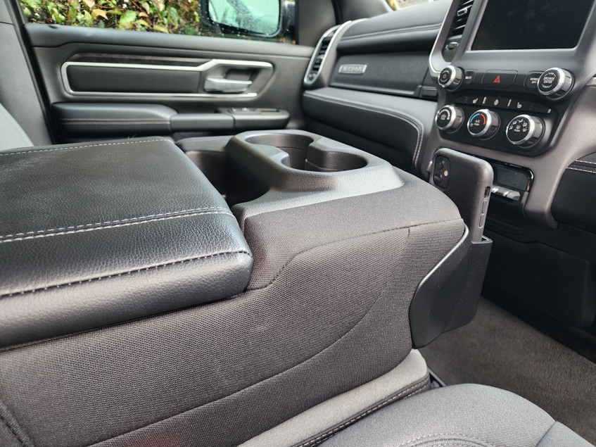 You might note that this is a technically a six-seat cabin; but the Ram is only certified as a five-seater for Australasia, so the centre-middle chair is locked down permanently. It's still very obviously a seat, though; the release for the backrest has been removed and replaced with a neat little phone holder.