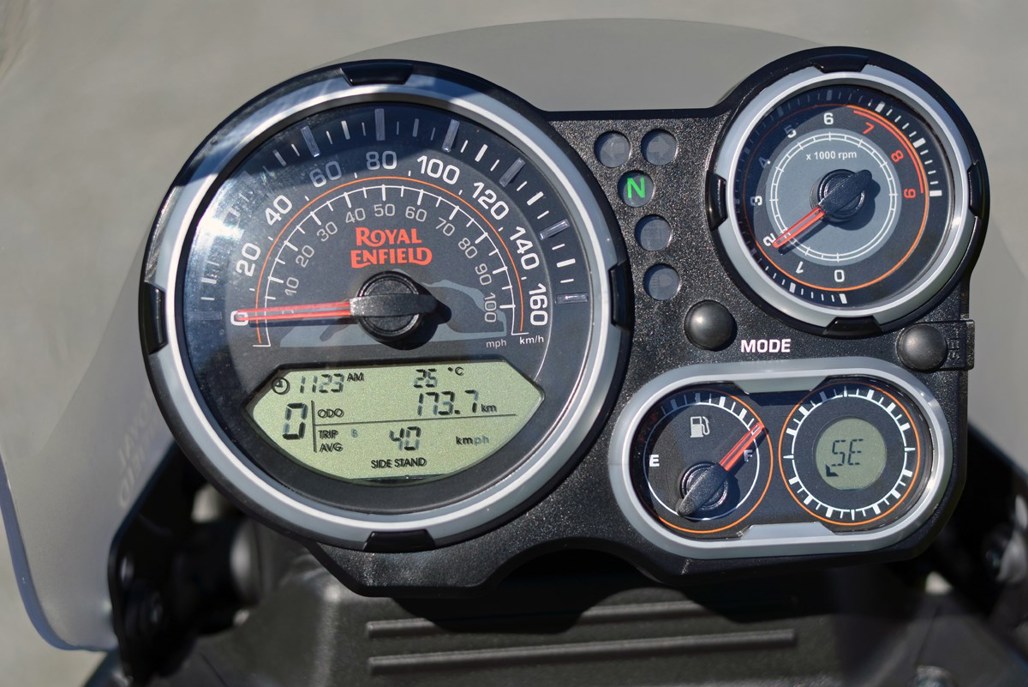The Himalayan's instrument cluster sits between an exoskeleton frame behind the handlebars. It's a busy set-up but all the information you need can be read at a glance.