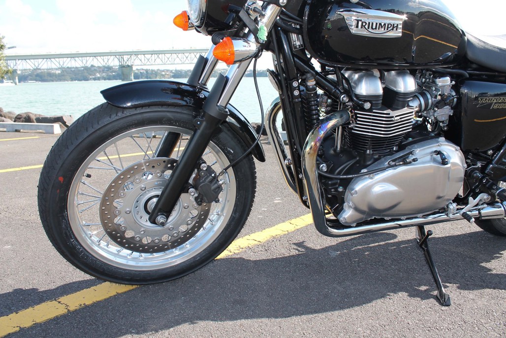 The riding position isn’t as extreme as it looks, and although the rearsets put you in a forward lean, the handlebar doesn’t take on too much of your weight, so there’s not an excessive amount of pressure causing aching wrists as you’d find in a bike with clip-on bars. While it has the racy looks, the Thruxton is limited by the classically inspired tyres, which wrap the brilliant chrome-spoked 17- and 18-inch wheels.